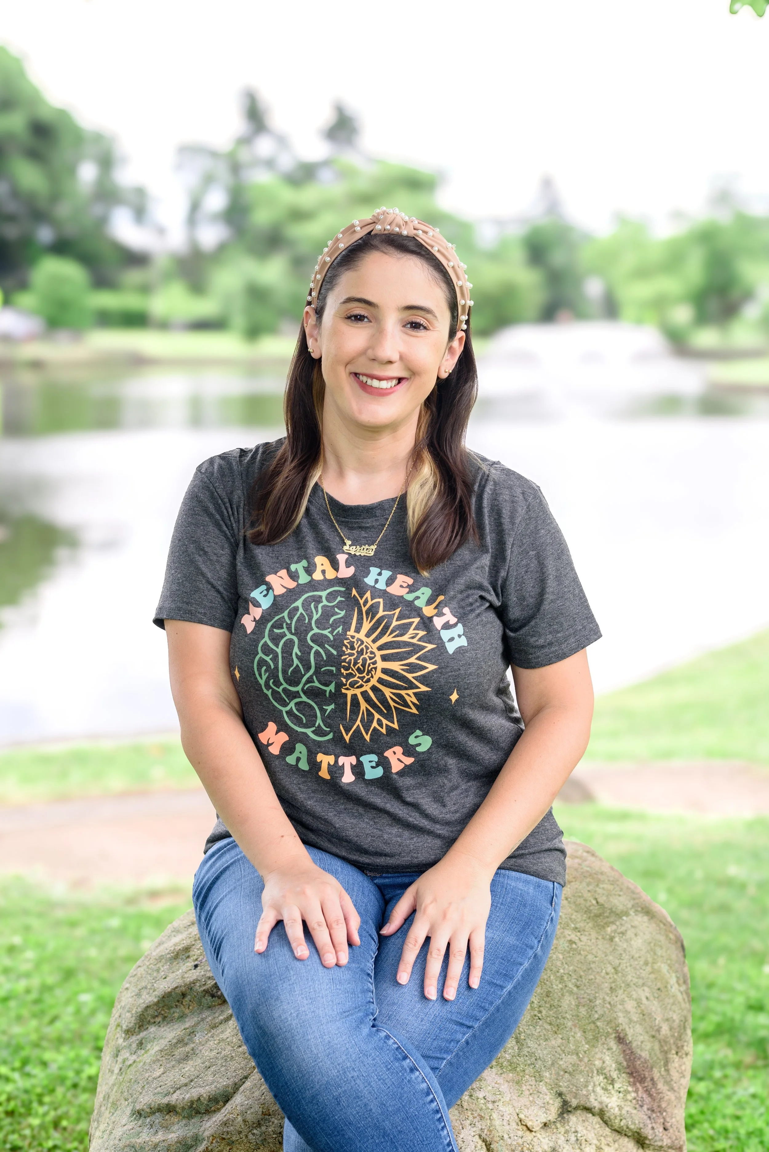 • Woman sitting on a rock in a park, wearing a "Mental Health Matters" T-shirt and a headband.