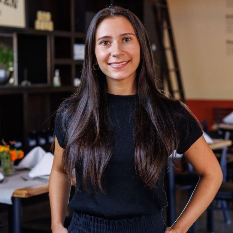 • A woman with long dark hair, wearing a black shirt, smiling and standing in a restaurant.